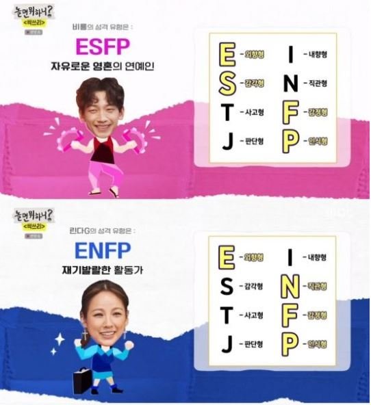 최근 MBTI 성격유형 테스트가 인기다. 특히 MBC '놀면 뭐하니?'에서 이효리, 비, 유재석이 MBTI 테스트에 참여해 눈길을 모았다. 당시 방송에서는 테스트 결과가 출연진들의 실제 성격과 비슷해 웃음을 자아냈다. 이에 MBTI 성격유형 테스트가 더욱 주목을 받고 있다.