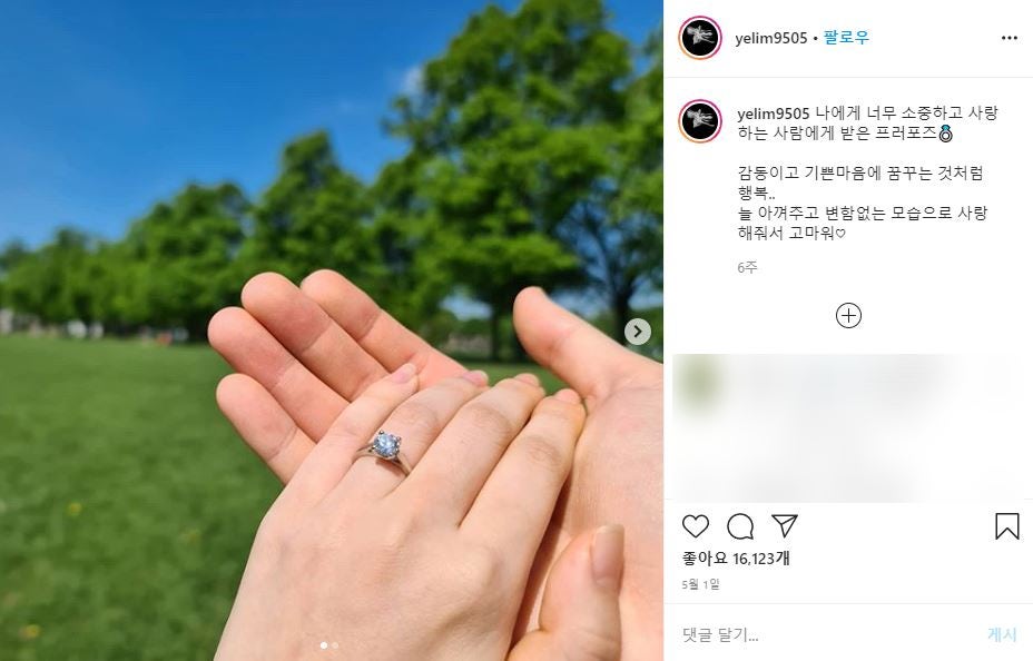 앞서 최예림은 자신의 인스타그램에 왼손에 반지를 낀채 손을 맞잡고 있는 사진을 공개했다.