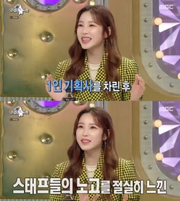 전효성은 "그전까지 연예인의 입장으로 보다 보니 스태프들의 노고를 잘 몰랐다. 1인 기획사를 차린 후에는 여러 가지를 도맡다 보니 스태프들의 노고를 알겠다"고 설명했다.