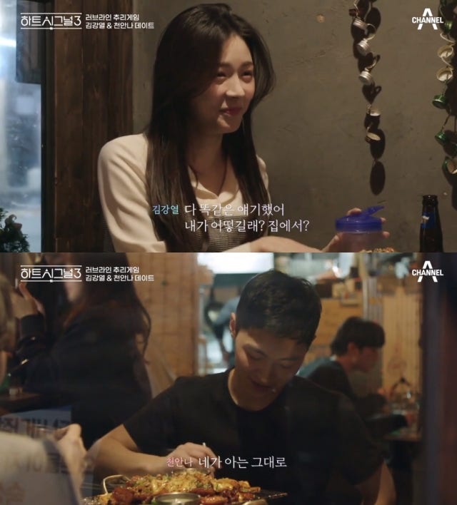 일각에서는 김강열과 천안나가 `하트시그널3` 방송 중에는 잘 되지 않았지만 이후 친해진 것이 아니냐는 추측을 하고 있다. `하트시그널3` 마지막회는 24일(수) 오후 10시에 방송된다.