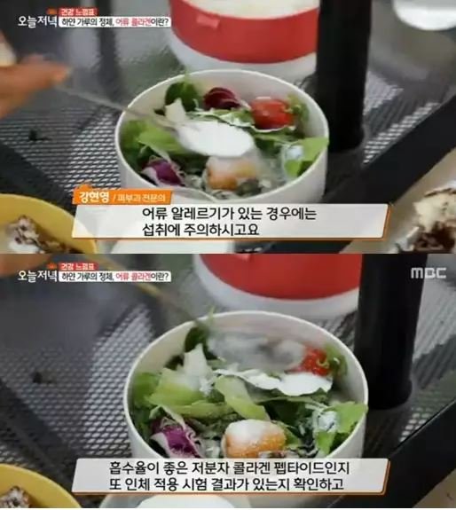 또 한혜진은 저분자 어류 콜라겐을 꺼냈다. 그는 저분자 어류 콜라겐을 고등어구이에 뿌려 먹고 물어 타 먹었다. 전문가는 "육류 콜라겐은 어류 콜라겐에 비해서 분자의 크기가 커서 흡수율이 낮은 편이다"라며 "어류에서 추출한 콜라겐은 모발 굵기의 1/125,000 정도로 크기가 작고 피부의 구조가 유사해 체내 흡수가 더 잘 된다는 장점이 있다"고 전했다.
