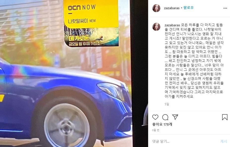 서유정은 지난 23일 자신의 인스타그램에 한 케이블 채널에나온 영화 ‘나랏말싸미’의 방영 예고 화면을 캡처해 올리며 전미선을 추억하는 글을 올렸다.