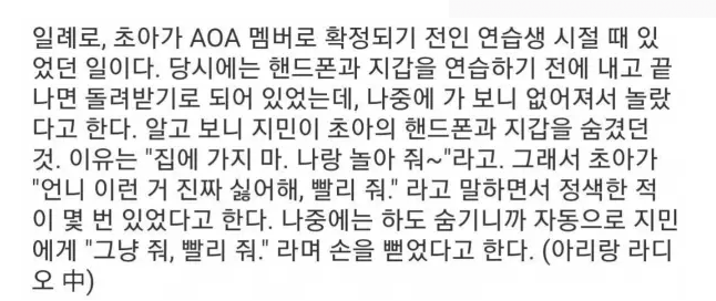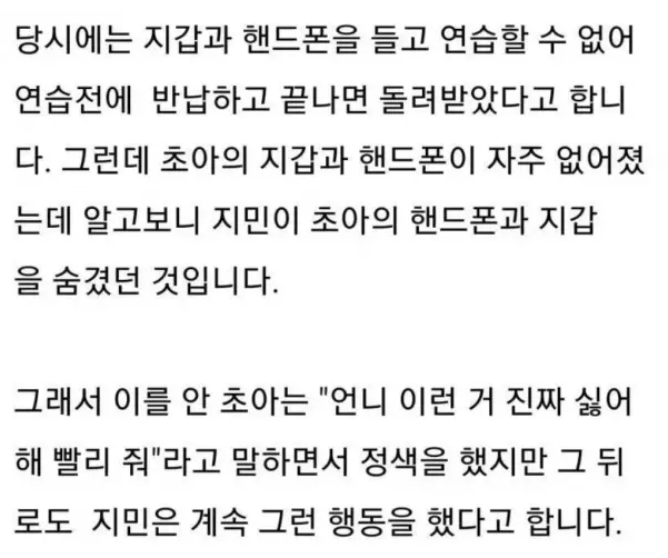 글쓴이는 "연습생 시절 당시 지갑과 핸드폰을 들고 연습할 수 없어 연습 전에 반납하고 끝나면 돌려받았다. 그런데 초아의 지갑과 핸드폰이 자주 없어졌는데 알고보니 지민이 초아의 핸드폰과 지갑을 숨겼던 것이다"라고 말문을 열었다.