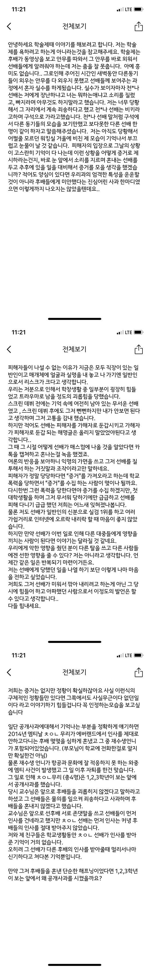 글쓴이는 “추가로 더 심한 증언들도 있으며 현재도 올라오고 있습니다. 적어도 양심이 있다면 우리 과의 엄격한 특성을 운운할 것이 아니라 후배들에게 미안했다는 진심어린 사과 한 마디였으면 이렇게까지 나오지는 않았을 것”이라며 천안나의 사과를 요구했다.