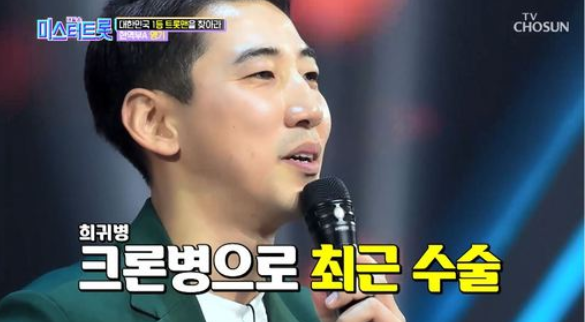 TV 조선 예능 '미스터트롯' 에서 '한잔해' 열창하면서 큰 인기를 받고 있는 개그맨 겸 가수 영기가 크론병때문에 큰 수술을 했다고 밝혔다. 크론병은 소화기관 전체에 발생할 수 있는 만성 염증성 장질환이다 .