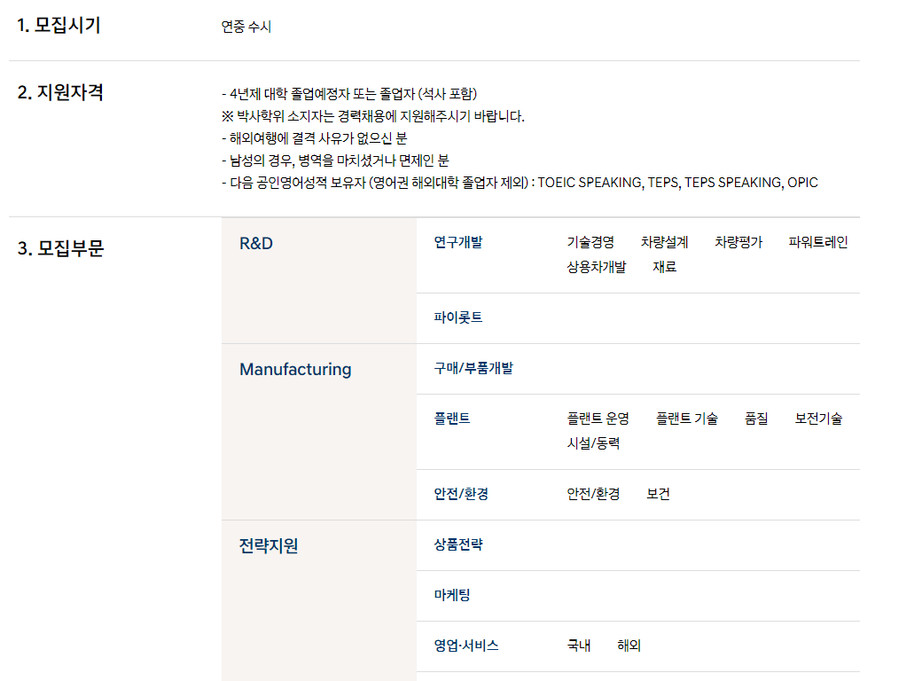 현대·기아차는 지난해 일반직 및 연구직 대졸 신입사원 채용을 상시 공개채용 방식으로 전환했다. 신입사원 정기공채를 없애는 대신 각 현업 부서가 필요한 인재를 수시로 뽑는다.