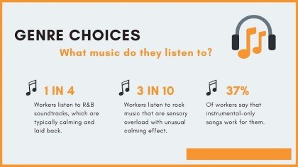직장인들이 주로 잘 듣는 음악 장르와 관련한 설문도 있다. 현지 매체 미러는 또 다른 보고서를 인용, 근로자 4명 중 1명꼴로 알앤비 사운트 트랙을, 그리고 10명 중 3명꼴로 록을 듣는다고 밝혔다. 이 두 장르가 작업에 있어 가장 효과적이라는 것으로, 알앤비의 경우 매우 차분하고 느린 템포가 집중력을 올려주며, 반대로 완전히 다른 형태의 록은 시끄러운 소리로 인해 비정상적으로 차분한 영향을 미친다는 설명이다.