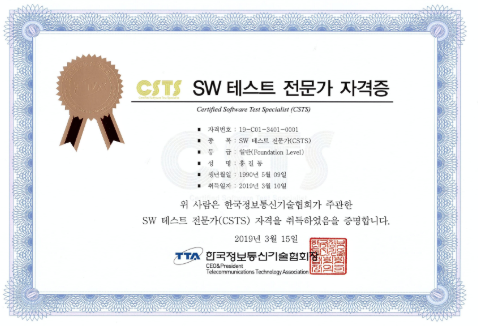 SW 테스트 전문가 자격증은 CSTS라고 부르기도 한다. 한국정보통신기술협회에서 주관하는 민간 자격증으로, 소프트웨어 테스트 개요 및 프로세스에 대한 기본 지식을 갖출 수 있게 도와주는 자격증이다.