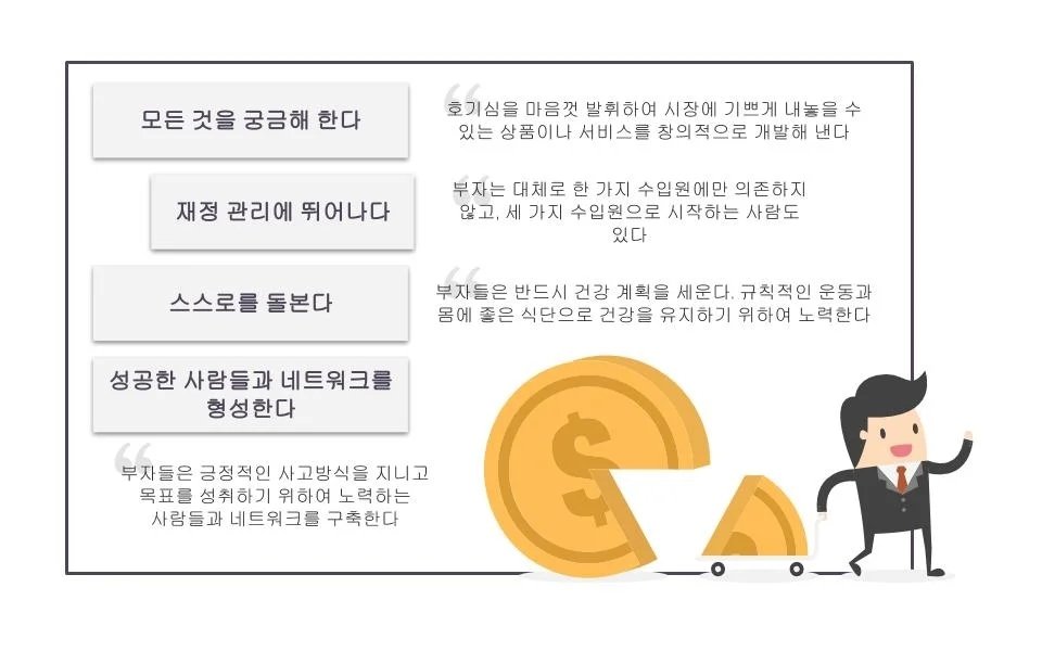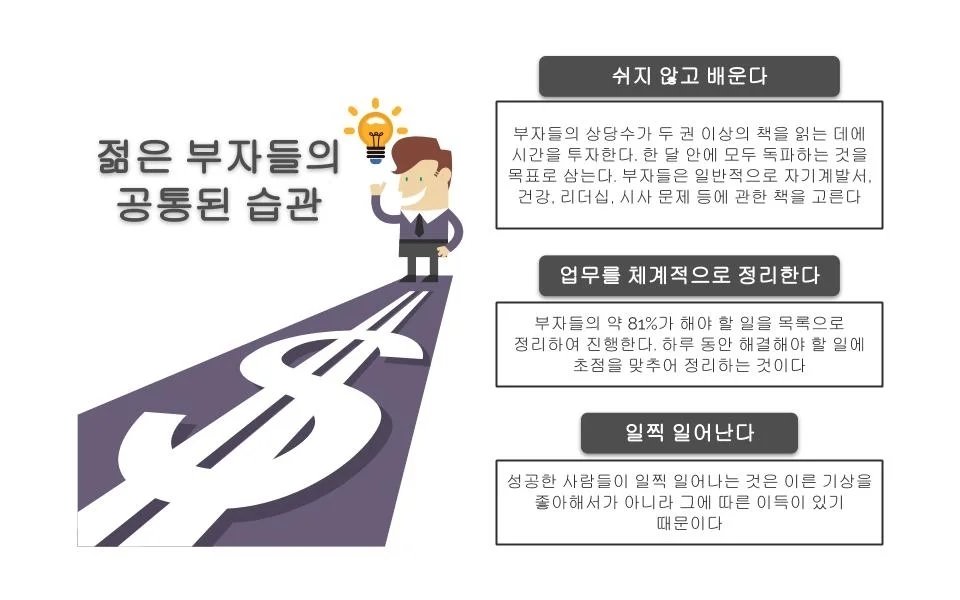 단순해 보이는 습관이지만 중요한 것은 일관성을 유지하는 것이다. 물론 자신에게 맞는 방식의 습관을 찾아내는 것도 좋다. 언젠가 부자들의 목록에 당당하게 이름을 올리게 될지도 모르는 일이다.