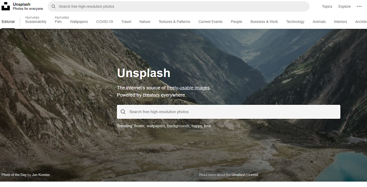 언스플래시는 픽사베이와 마찬가지로 어느 곳에서든 이미지를 무료로 사용할 수 있다. 전세계 사람들이 올린 멋진 무료 사진을 언제 어디서나 온오프라인에서 상업적 용도로 무료로 사용 가능하다.