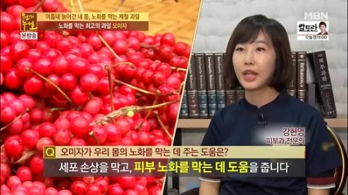 오미자를 차로 꾸준히 섭취하게되면 목을 보호하는데 효과적이라고 한다. 목의 점막에 생긴 염증을 제거하는데도 좋으며 후두염을 예방하고 개선한다. 뿐만아니라 오미자는 피부미용에 좋으며 다이어트, 피로회복에도 좋다.