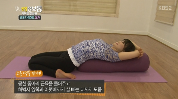 무릎을 꿇고 바닥에 앉아서 양발을 엉덩이 바깥 방향으로 향하도록 한다. 그리고 몸을 점차 뒤로 숙여준다. 팔꿈치로 지지하며 천천히 눕는다. 다음 누워서 충분한 호흡을 하면 된다. 팔은 몸 옆에 두거나 발을 잡아준 상태에서 1분간 진행한다.