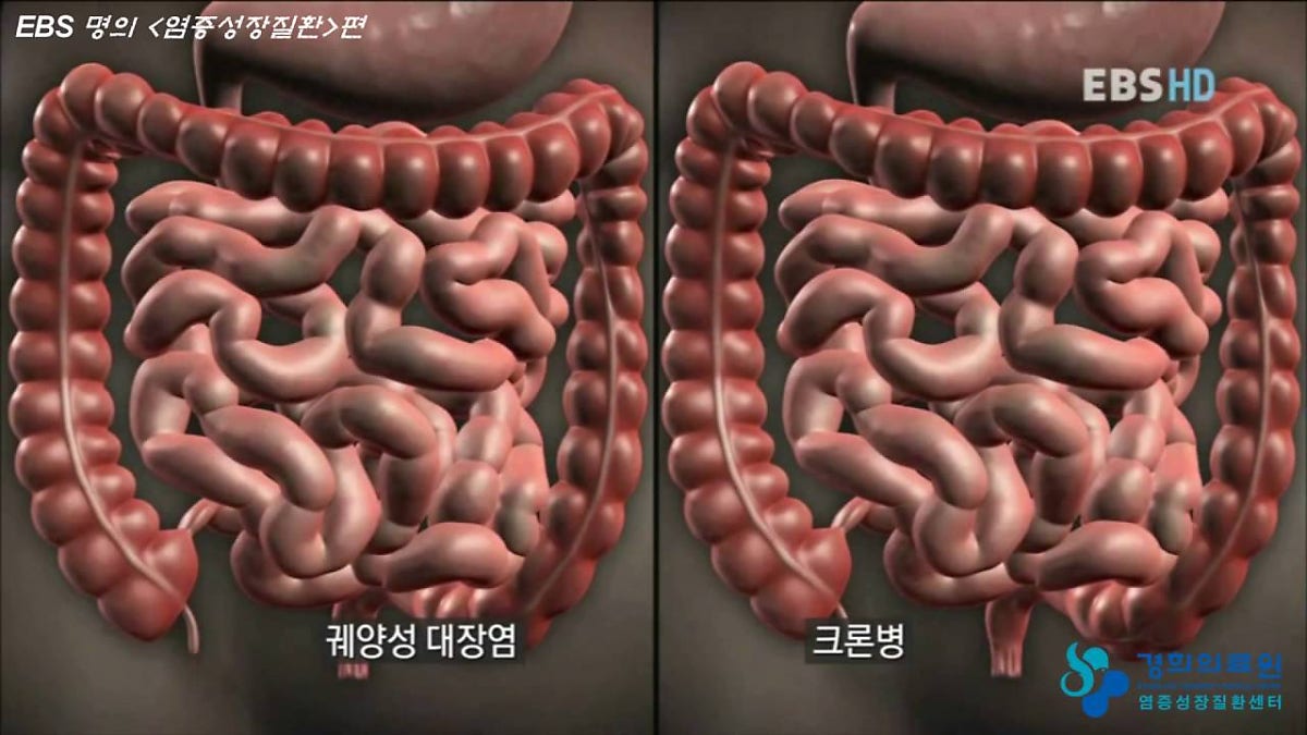 하지만 궤양성 대장염은 대장에만 생기는 데 비하여 크론병은 대장뿐만 아니라 소장에도 염증이 생길 수 있다. 증상은 매우 유사하지만 출혈은 궤양성 대장염에서 좀더 흔한 반면에 복통이나 체중감소는 크론병에서 좀더 현저하게 나타난다.