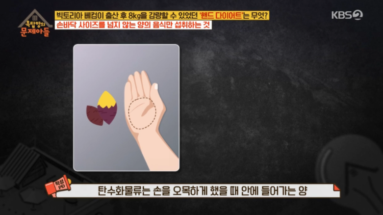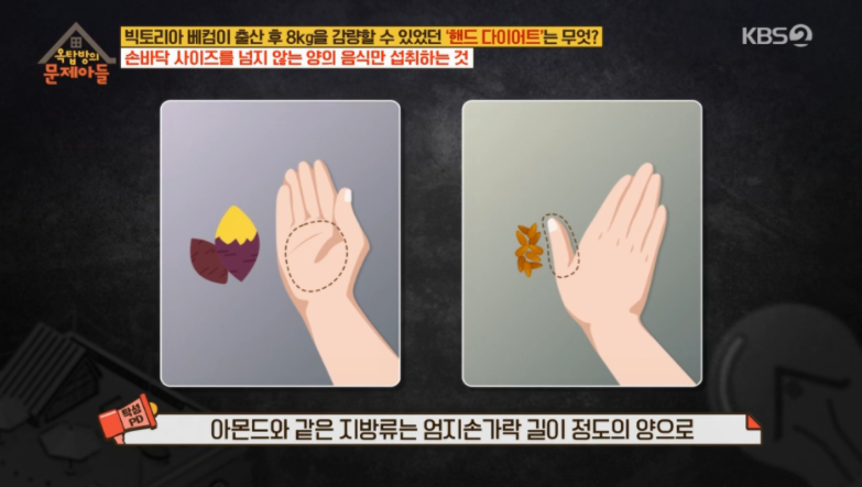 과일은 꽉 쥔 한 주먹 크기와 부피만 섭취하고, 밥의 경우 손바닥을 C모양으로 오므렸을 때 밥이 꽉 차는 양이다. 설탕이나 기름은 검지 한 마디의 부피만큼이다.