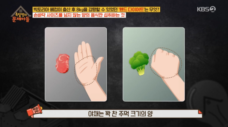 고기와 생선은 손바닥 두께 정도이며, 채소의 경우 손가라만 살짝 구부려 손을 오므린 모양으로 한 손 가득 잡힌 만큼만 섭취한다.