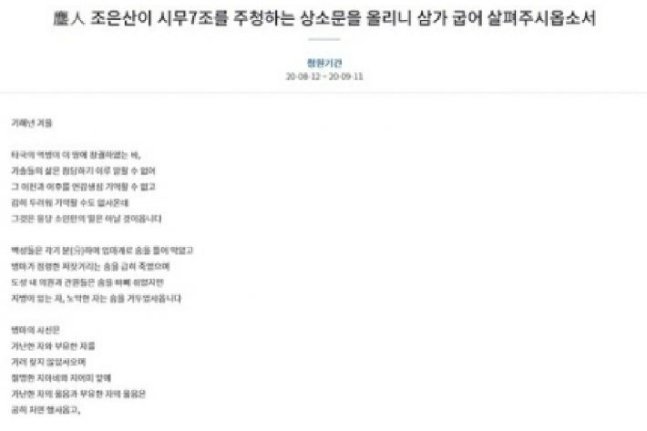 청와대 국민청원 게시판에 올랐다가 사라져 논란이 된 이른바 ‘시무7조’ 게시물을 청와대가 공개하기로 했다.