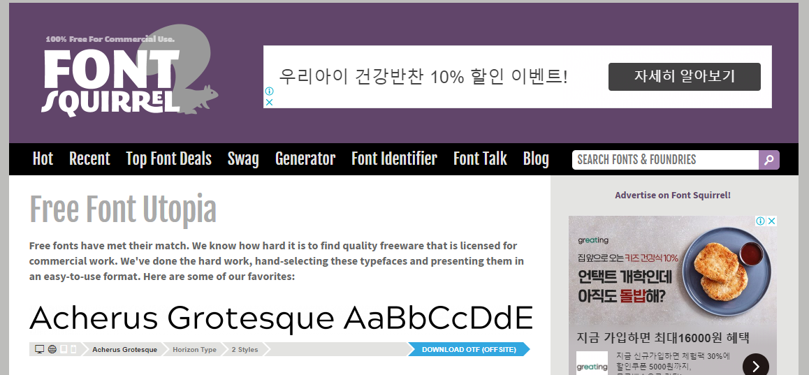 자칭 ‘무료 폰트 천국’이라고 불리는 폰트 스쿼럴은 상업적인 용도로도 무료로 사용할 수 있는 폰트를 찾는 이들에게 좋은 사이트이다. 모든 폰트에 대해서 라이선스 조사를 했으며, 이에 주의 깊게 선별과정을 거친 폰트들을 소개하고 있다.