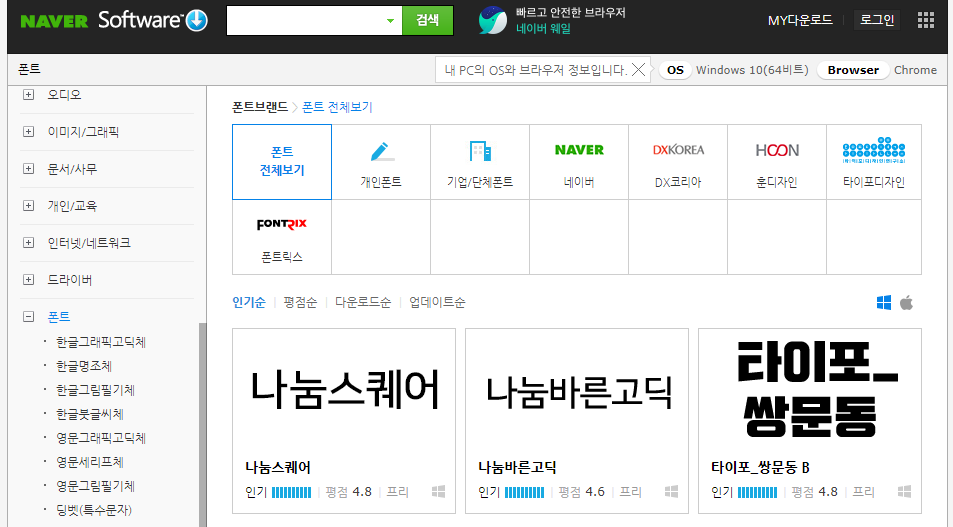 한글 폰트를 무료로 다운 받을 수 있는 네이버 폰트 사이트이다. 다양한 폰트들을 다운받을 수 있으며, 현재 네이버 폰트에 등록된 폰트들은 전부 무료다. 누구나 프리웨어로 손쉽게 사용할 수 있다.