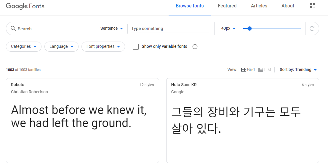 무료 폰트의 선두주자인 구글이다. 135개 이상의 언어에서 사용할 수 있는 거의 1,000개의 폰트를 보유하고 있는 구글 폰트는 디자이너, 폰트 애호가는 물론이고, 개인적인 용도와 상업적인 용도의 폰트를 다운로드하고자 하는 사람들이라면 누구나 들러봐야 할 곳으로 자리를 매김하고 있다.
