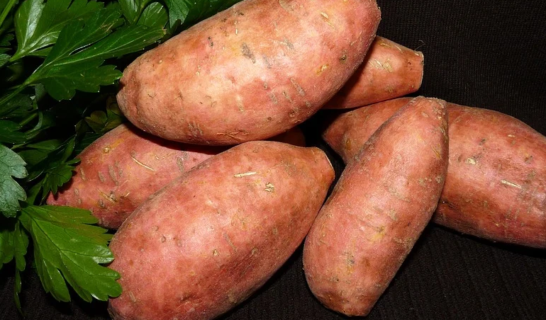 고구마는 특히 칼륨 성분이 많은 알칼리성 식품으로 혈압과 스트레스를 조절하고 피로를 막는 효과가 있다. 칼륨은 인체에 남아 있는 나트륨을 소변과 함께 배출시키는 작용과 혈관을 확장시키는 작용으로 혈압을 조절하므로 가벼운 고혈압 등의 성인병을 예방한다.