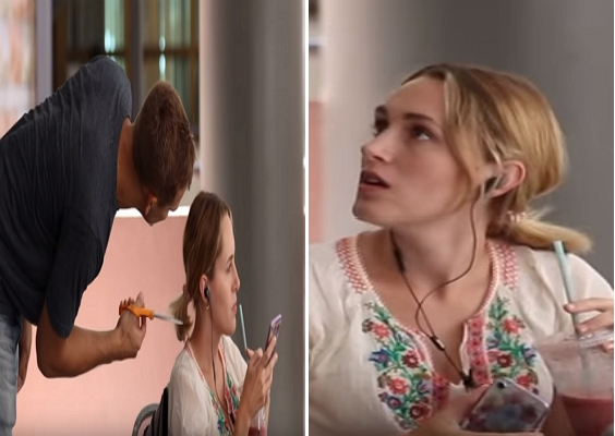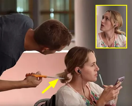 이어폰을 끼고 책을 보는 여성의 뒤로 한 남성이 슬그머니 다가간다. 주머니에서 몰래 가위를 빼 이어폰을 ‘싹둑’ 자른다. 황당하다는 듯이 쳐다보는 여성에게 남성은 사과를 건네고 잠시 후 에어팟을 준다. 여성은 크게 기뻐해야 할지 난감해 하면서도 얼굴에 미소를 띠었다.