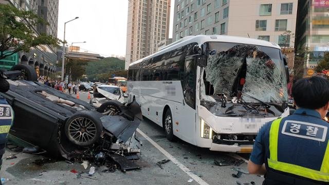 사고 충격으로 포르쉐 차량은 완전히 전복됐고, 오토바이는 절반이 분리됐다. 버스 앞 유리도 크게 파손됐다. 사고 차량들의 파편도 도로 곳곳으로 튀었다.