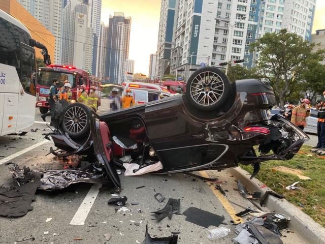 14일 부산경찰청에 따르면 오후 5시 43분께 해운대구 한 교차로에서 신호를 위반해 고속으로 달리던 포르쉐가 앞서가던 승용차를 들이받는 바람에 버스와 승합차, 오토바이 등이 잇달아 부딪치는 7중 추돌사고가 발생했다.