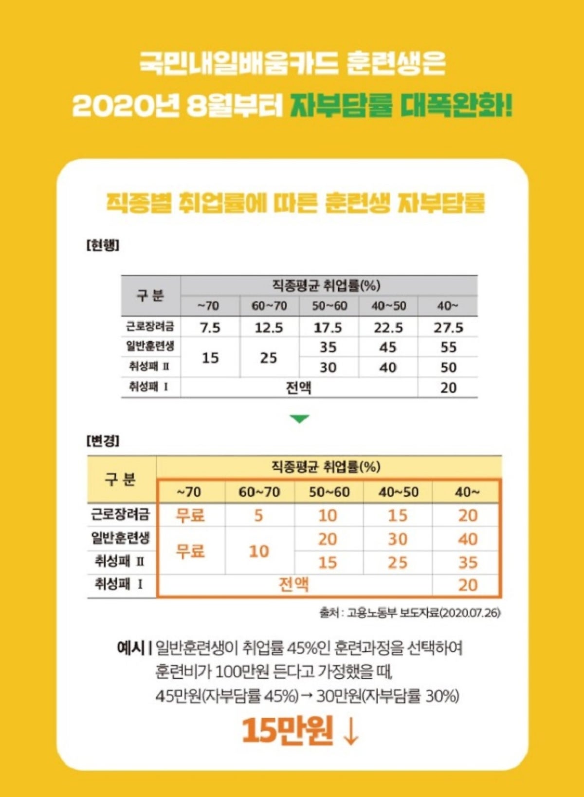만약, 일반훈련생이 취업률 45%인 훈련과정을 선택하여, 훈련비가 100만원 든다고 가정했을 때, 45만원(자부담률 45%->30만원(자부담률 30%)로 15만원 할인된 혜택을 받을 수 있습니다.