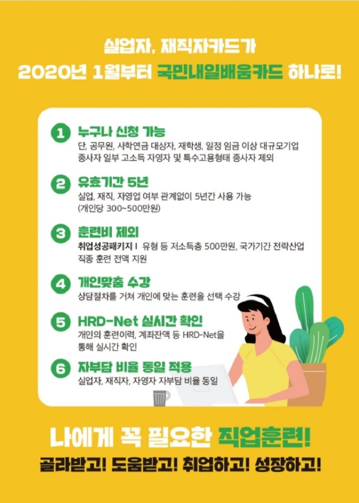 기존 실업자‧재직자로 분리‧운영되던 내일배움카드를 국민내일배움카드로 2020년 1월부터 통합됐습니다.