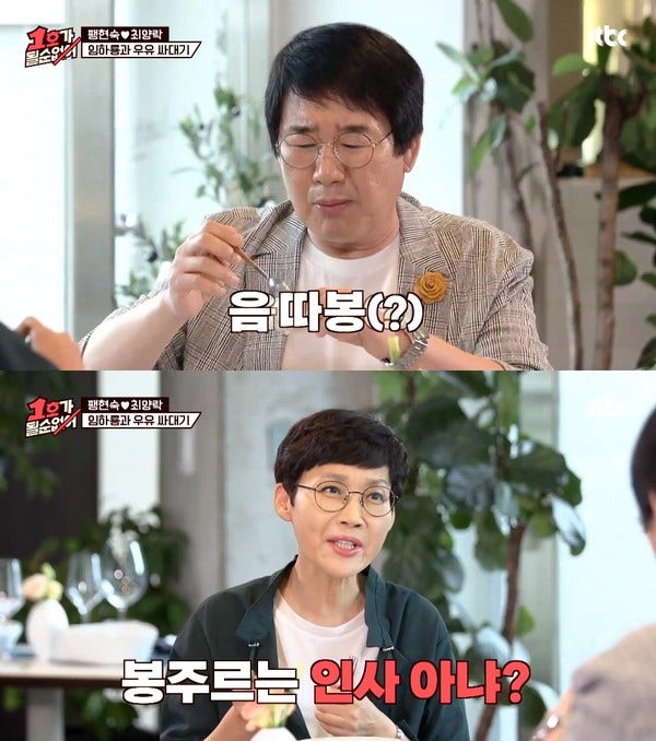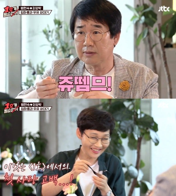 최양락의 사랑 고백에도 팽현숙은 눈치채지 못하고 음식을 먹었습니다. 최양락은 스튜디오에서 "의도가 있었는데 그걸 못 알아들었다"라며 답답해했는데요. 그는 다시 해보라는 후배들의 성화에 부끄러워하며 "쥬뗌므"라고 얼버무렸습니다.