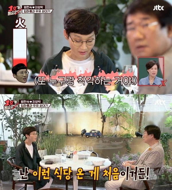 1일 방송된 JTBC `1호가 될 순 없어`에서는 최양락이 팽현숙과 함께 임하룡의 초대를 받아 프랑스 레스토랑 '윌로뜨'로 향했습니다.