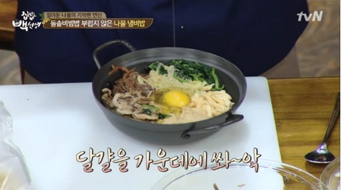 2. 나물을 얹고 가운데에 달걀을 넣습니다.