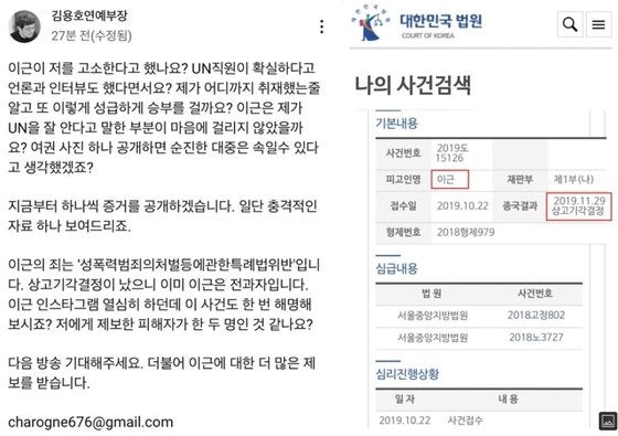 앞서 이근 대위의 가짜 UN 경력 의혹을 제기한 유튜버 김용호씨는 12일 자신의 유튜브 채널 커뮤니티에 성범죄 관련 의혹을 추가 폭로하면서 피고인 이근으로 표시된 '성폭력범죄의처벌등에관한특례법위반(공중밀집장소에서의추행)' 재판 이력을 공개했는데요.