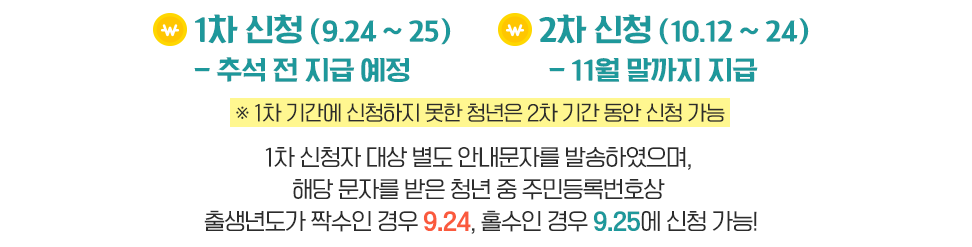 또한, 1차 신청 대상자로 안내 문자를 받았음에도 1차 신청 기간에 신청하지 못한 청년도 이 기간에 신청 가능합니다.