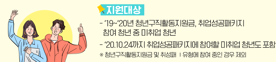 2차 신청 기간에는 2020년 구직지원프로그램 (취업성공패치키,청년구직활동지원금) 종료자, 진행중인 자, 신규 참여자가 신청 가능하고, 기존에 구직지원프로그램에 참여하지 않았더라도 , 취업성공 패키지에 2020. 10. 24까지 참여하는 경우 지원금 신청이 가능합니다.