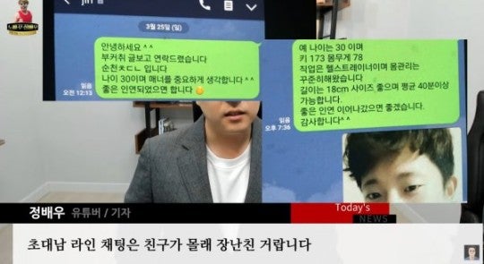 앞서 정배우는 지난 새벽 자신의 유튜브에 “로건 교관이 과거 몸캠 피싱을 당해 촬영한 사진이다”라며 한 남성의 사진을 공개했습니다. 중요 부위는 가려졌지만 탈의한 상체와 얼굴은 그대로 드러났는데요.