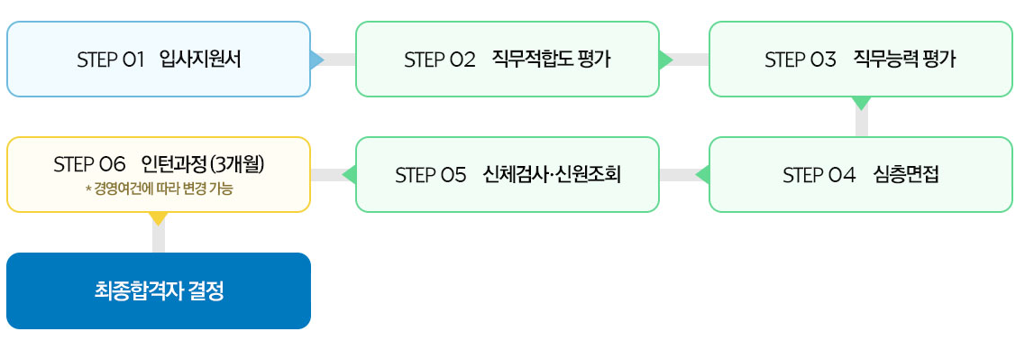 입사지원서 >직무적합도 평가 >직무능력 평가 >심층면접 >신체검사 신원조회 >인턴과정 (3개월) (경영여건에 따라 변경 가능)